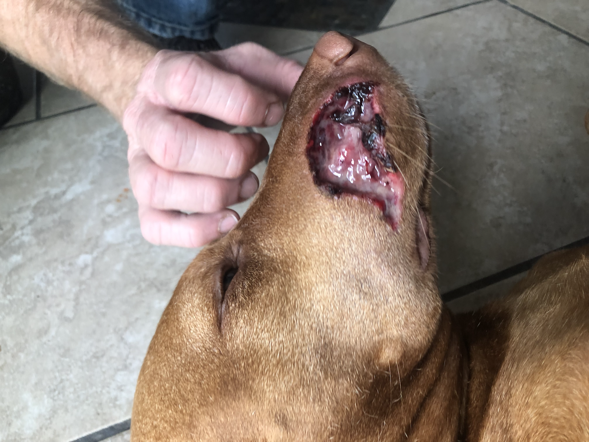 One week in. Most of the side of her face tissue is dying, and will regrow